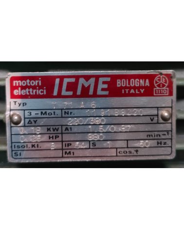 Le ICME T71A6 (T 71 A 6) est un moteur asynchrone triphasé compact de la série T de ICME (Industrie Costruzioni Motori Elettrici, Italie), frame 71, variante A6. Ce motorisateur de positionnement est adapté aux lignes de conditionnement et de remplissage à cadence soutenue, notamment dans les secteurs agroalimentaire, pharmaceutique et cosmétique. La double notation T71A6 / T 71 A 6 identifie le même modèle selon les pratiques de désignation ICME.